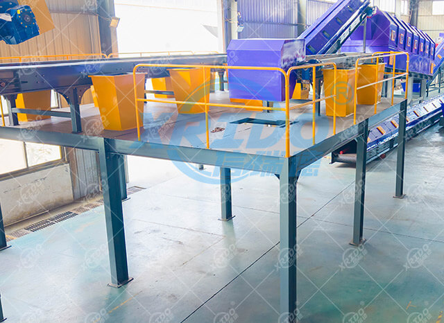 The manual sorting platform consists of belt conveyor, platform,silo,safety protection device,light steel workshop (optional) etc, material is along with material to the sorting platform. Such as plastic, paper, fabric, battery, glass etc will be sorted and put to different silos by workers. The left material will go next step , the belt conveyor takes VFD and places at middle part. There is a silo for every station at both sides of sorting platform.