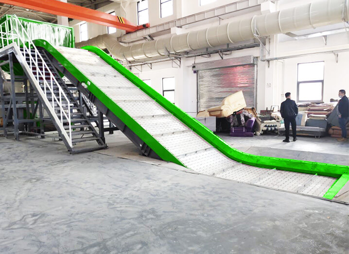 After crushing, it is sent to the magnetic separator by the conveyor belt for magnetic separation. Metal materials such as iron wires and nails are automatically sorted out for recycling.
